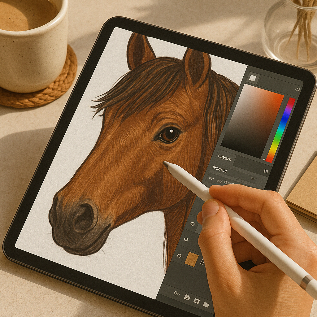 Every NueCraftDesign portrait is hand-illustrated by our skilled digital artists, using a careful and artistic process - never filters or apps - to capture the personality and spirit of your horse.